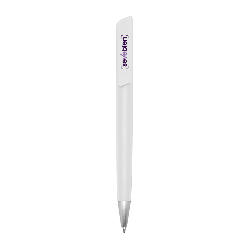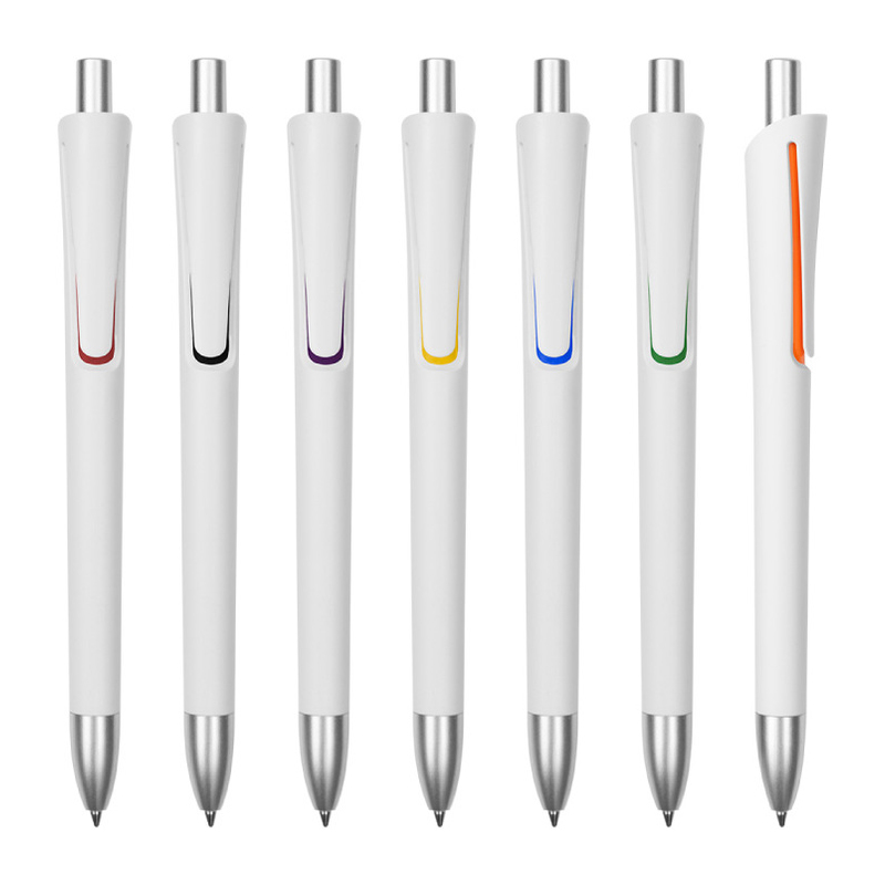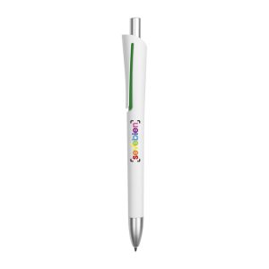 Bolígrafo con cuerpo plástico de color, botón pulsador y puntera color plata.