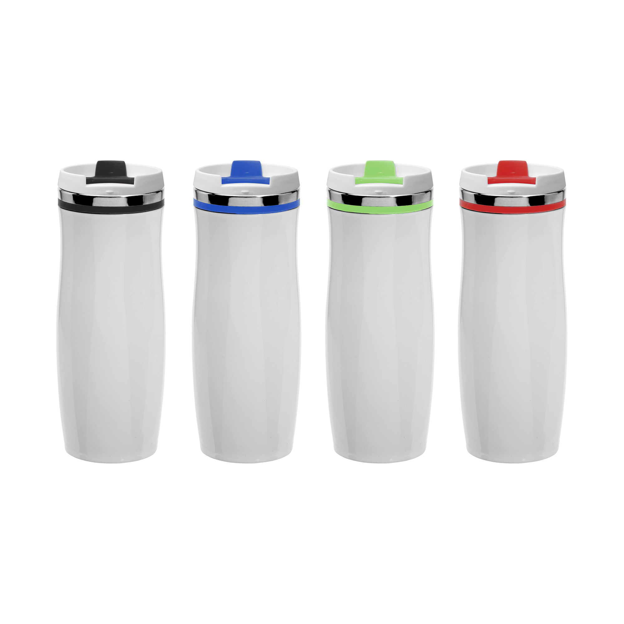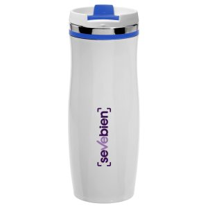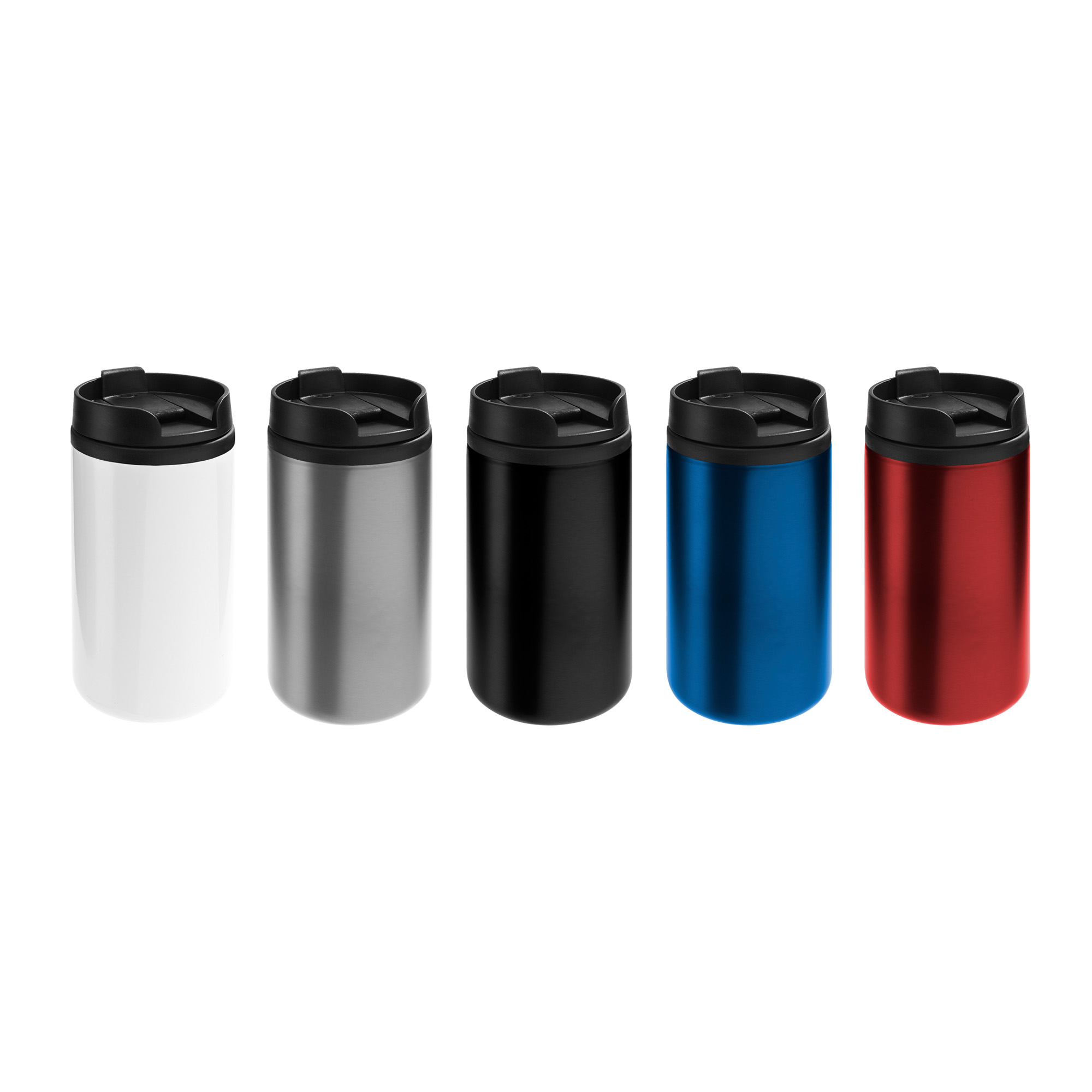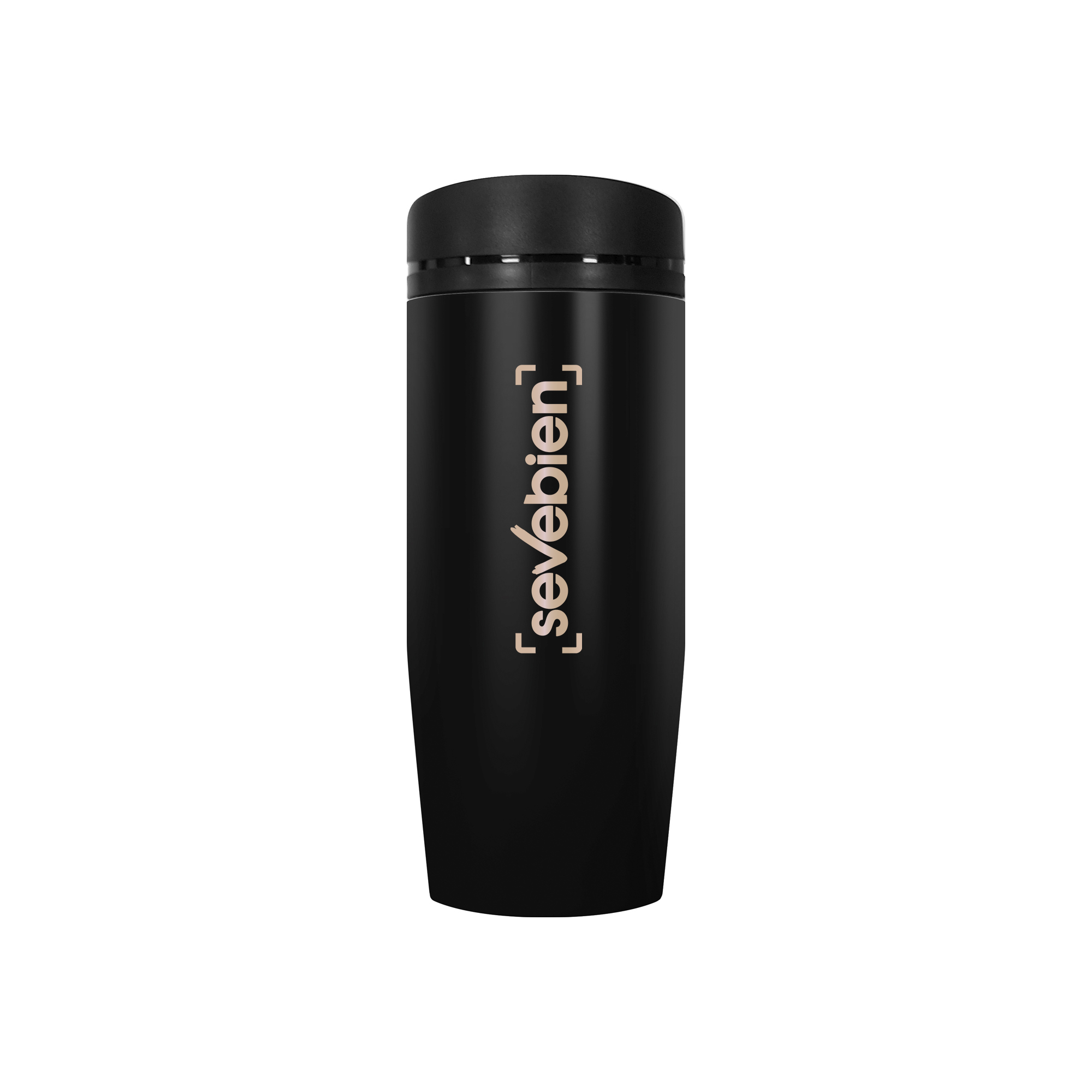 Elegantes Mug doble pared. Interior de acero 304 y exterior de acero 201. Tapa plástica.