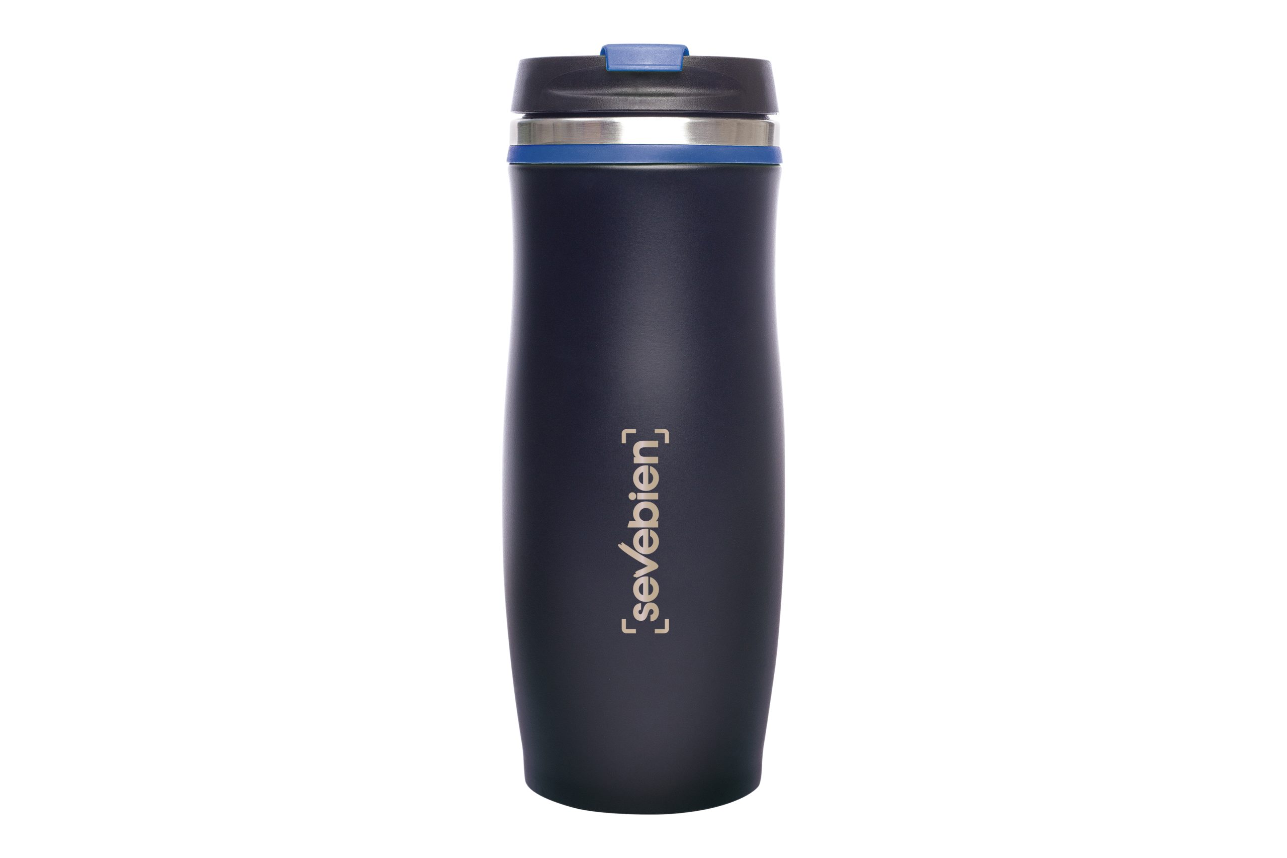 Elegantes Mug doble pared. Interior de acero 304 y exterior de acero 201. Tapa plástica.